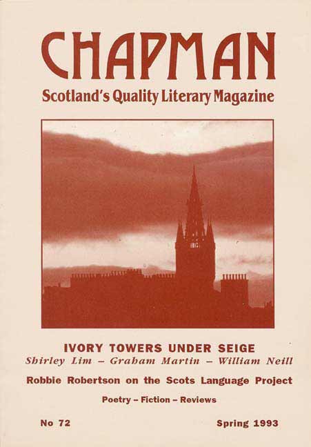 Promises to ruffle a few feathers. The Chinese-Malay poet and critic Shirley Geok-lin Lim examines orthodoxies of American feminist criticism etc in a meditation on language, race, nation and gender. Graham Dunstan Martin challenges the political imperatives behind deconstruction in ‘Uncritical Practice’, while William Neill decries the accelerating trend towards the academic establishment’s domination of the writing and dissemination of poetry. Robbie Robertson of the Scottish Consultative Council on the Curriculum writes on the Scots Language Project, aka The Scots Kist, an exciting development in teaching Scots which he pioneered as its guiding light. Edwin Morgan reviews Alastair Gray's Poor Things, plus poetry and fiction from George Gunn, Alex Hamilton, aonghas macneacail, Shuntaro Tanikawa, Maurice Lindsay, David Daiches, (check for surprises here!) Alex Hamilton; Maureen Sangster, Kenneth Steven &c.
